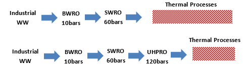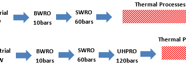 With recent developments on RO membrane market, ultra-high-pressure reverse osmosis (UHPRO) spiral wound membranes have been developed capable of withstanding 1800 psi (120 bar). UHPRO membranes enable the concentration of saline streams up to 130,000 mg/L total dissolved solids (TDS) for NaCl and 150,000 mg/L for Na2SO4 which means a 50% decrease in brine volume comparing to the standard types of membranes.
