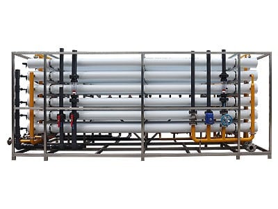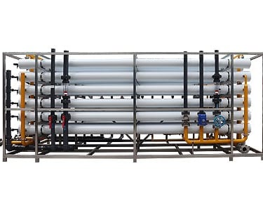 A high pressure pump is used to increase the pressure on the salt side of the RO and force the water to flow across the semi-permeable membrane., leaving most part (approximately 95%-99%) of the dissolves salts behind the stream.