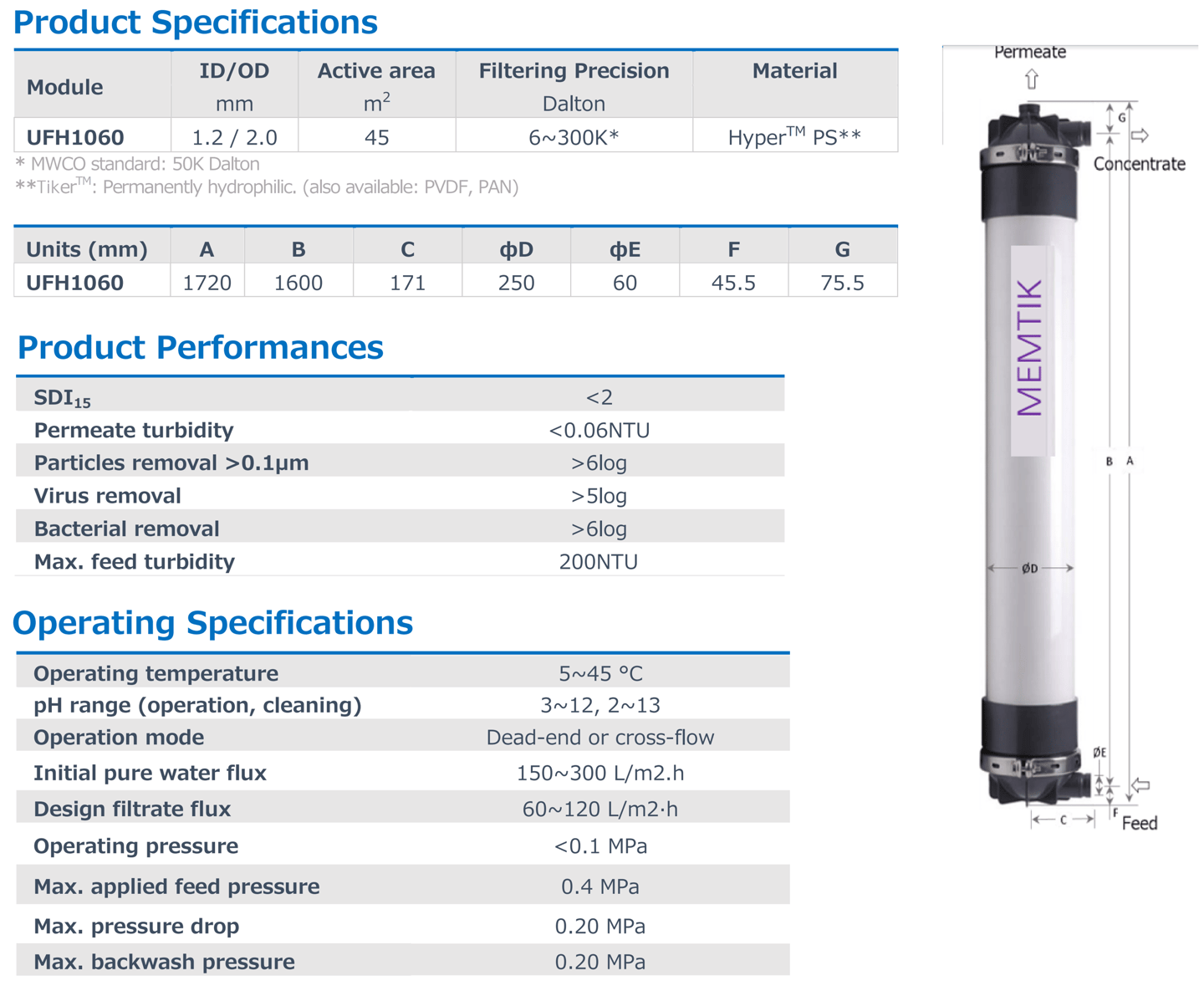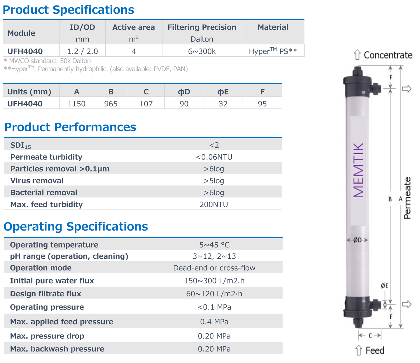 The UFH PS Series, structured with PS (permanently hydrophilic polysulfone) has the advantage of dry storage. It is designed to deliver highest molecular weight cut-off precision, low fouling and excellent uniformity of water distribution.