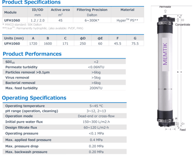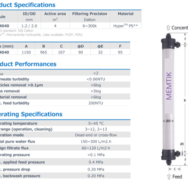 The Inside-Out UFH-PS Series ultrafiltration (UF) membrane is optimized for purification, separation & concentration of feed liquids with relatively low turbidity.