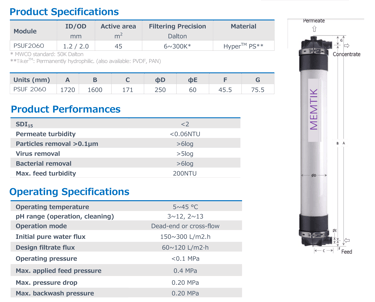 The Inside-Out PSUF Series ultrafiltration (UF) membrane is optimized for purification,separation & concentration of feed liquids with relatively low turbidity.The PSUF Series, structured with Tiker PS (permanently hydrophilic polysulfone) has the advantage of dry storage. is designed to deliver high molecular weight cut off precision, low fouling and excellent uniformity of water distribution.