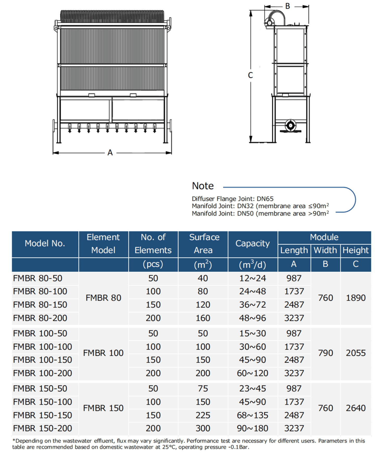 FSMBR 16 Single Deck Flat Sheet Membrane 150 Cassettes (Model No. FSMBR 16-150), FMBR PVDF Series is a high-flux Flat Sheet MBR membrane delivering excellent permeability, fouling resistance, stability, and elimination effectiveness. Structured with PVDF (permanently hydrophilic polyvinyl difluoride) has the advantage of dry storage. FMBR PVDF Series membranes can be used for a wide variety of treatment applications such as industrial and domestic wastewater.