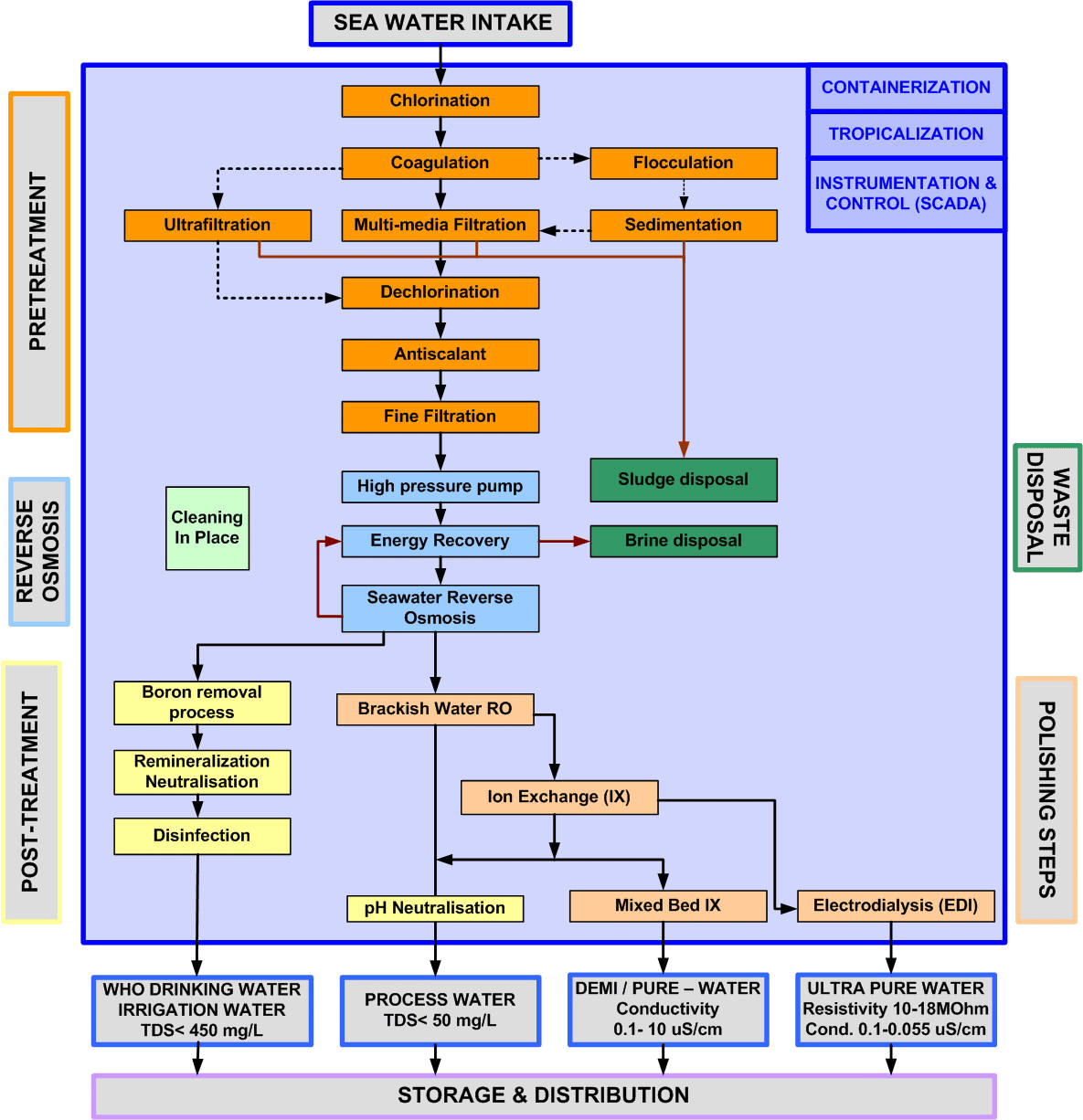 Memtik Water’s Sea Water Reverse Osmosis (SWRO) plants are designed to treat sea water, or high salinity ground water, with < 40,000 mg/L of dissolved solids (TDS) and < 30 mg/L of suspended solids (TSS), to achieve potable water quality. The standard treatment process involves pre filtration (auto backwashing multimedia filters and cartridge filters), anti-scalant dosing to prevent membrane scaling, RO desalination and auto flushing and CIP systems for membrane cleaning. Additional pre-RO and post-RO treatment steps may be added as required to suit feed water conditions and/or treated water quality requirements. The Memtik Water's SWRO plants are available as skid mounted or containerised systems.